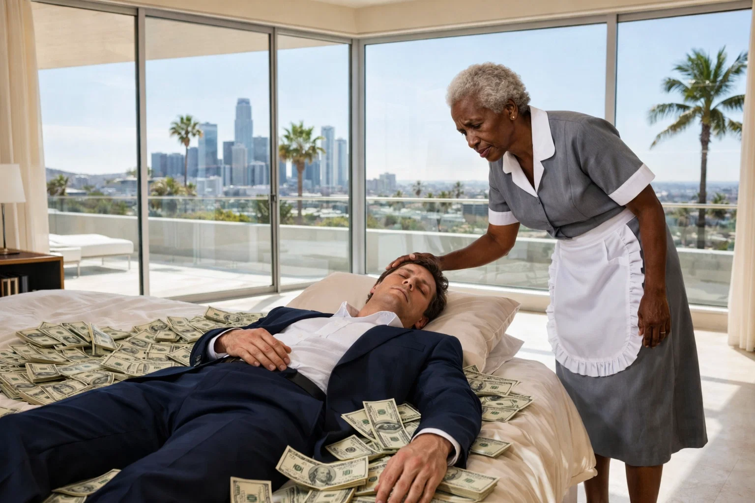 When she entered the room, the sight stopped her short. Her employer lay motionless in the middle of a pile of money. She softly called his name, unsure whether he was awake. He did not respond. For a few moments, she simply stood there, staring at the strange scene. Then she sighed, walked quietly to a chair, and picked up a blanket.