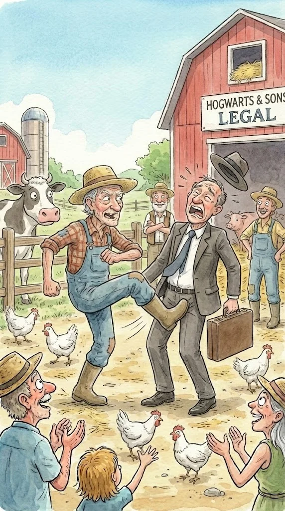 The lawyer was on all fours when the farmer’s third kick to his rear end, sent him face-first into a fresh cow pie.