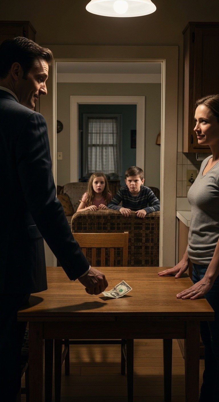 “Here’s five dollars. hope that’s enough,” my husband said as he walked out, leaving me and our kids for his new love. He thought he was clever, secretly selling our house before escaping abroad. but at passport control, an officer stopped him—and his dream trip ended in a detention room. What happened next, though, came from the one person he trusted most.