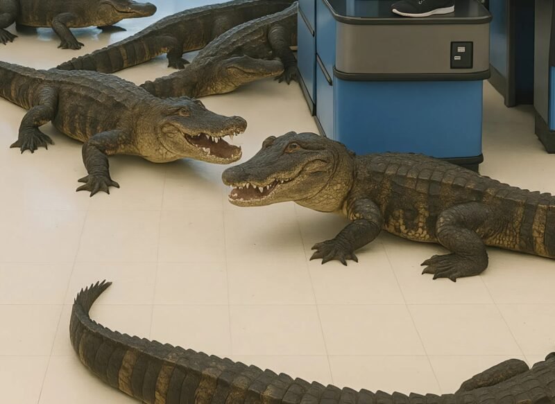 Shoppers were going about their daily routines when a scene from a nightmare unfolded inside a bustling supermarket. Without warning, dozens of alligators began to appear between the aisles, their sudden presence triggering a mass panic. People screamed and ran in every direction, some managing to flee through the doors while others sought refuge on top of high shelves and service counters. The alligators, confused and agitated, moved through the store, snapping at the air and knocking over displays in their path. The ordinary sounds of commerce were replaced by cries of fear and the unsettling sounds of the reptiles.