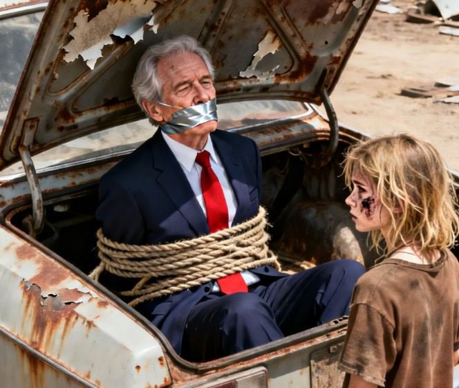 His wrists were bound. Tape sealed his mouth. His suit was wrinkled, torn, stained with sweat and dirt. Bruises darkened his face. His eyes—dark, exhausted—locked onto hers.