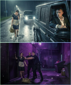 Warmth wrapped around her immediately. The interior smelled like leather and cedar. The rain became a distant hiss against thick glass. A driver sat up front, expressionless, hands steady on the wheel. Dante reached into a side compartment, pulled out a clean towel, and handed it to her.