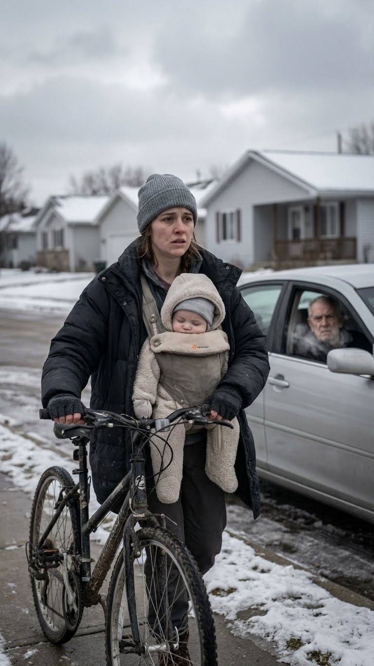 My legs felt disconnected from my body as I climbed into the sedan with Ethan pressed close. Warm air wrapped around me, smelling faintly of leather and some expensive cologne I couldn’t name. Ethan made a soft sound and relaxed against my chest. The bicycle was left behind in the snow. Something about that—leaving it there like a discarded version of myself—made my eyes burn.