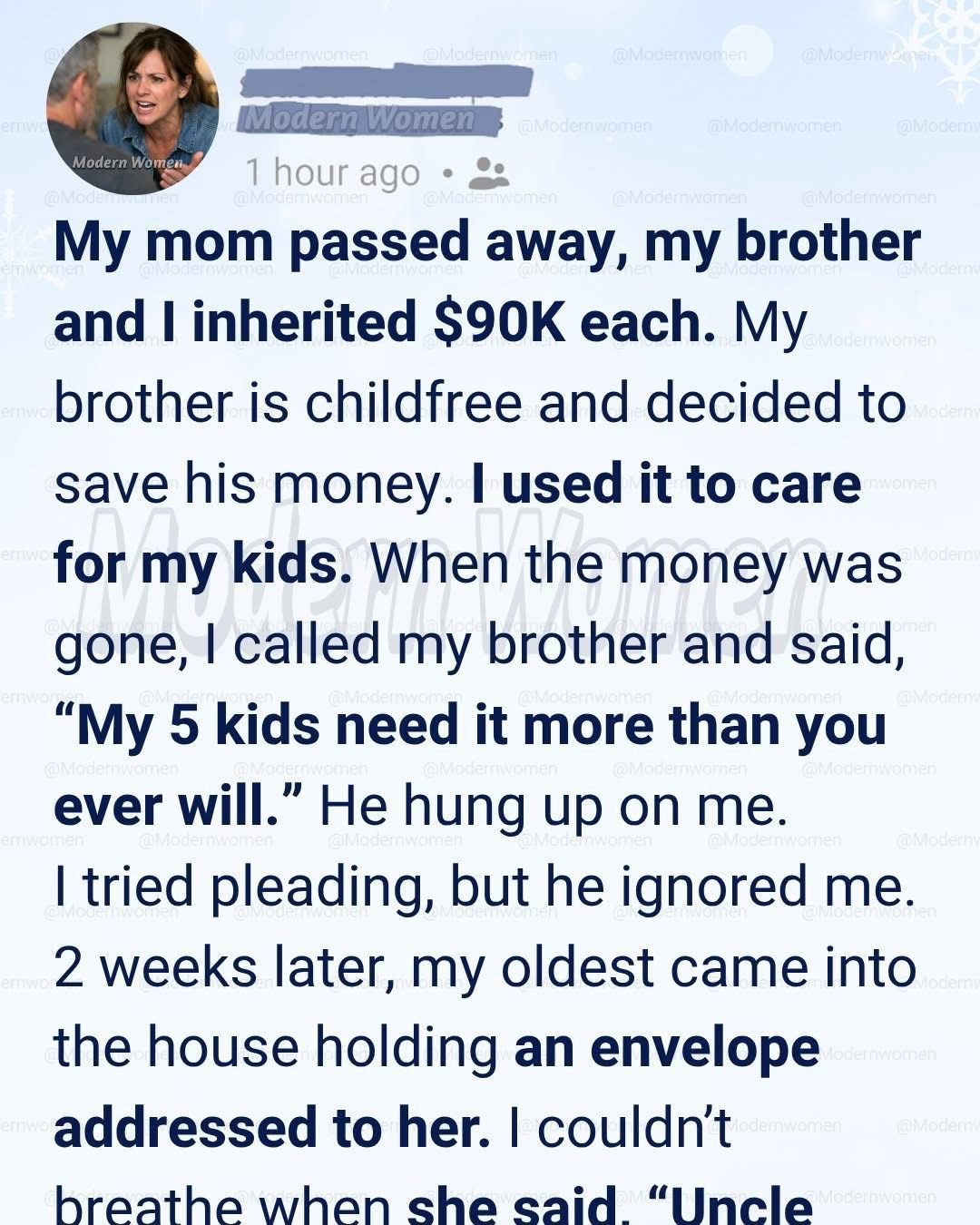 Then he said, quietly, “That wasn’t my plan for Mom’s money.”