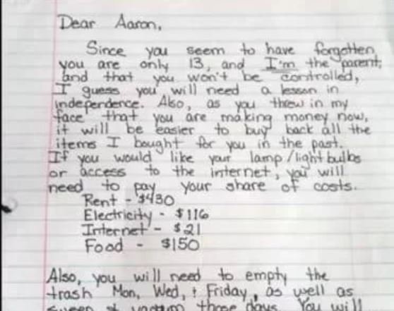 Hey Aaron, I see you forgot you’re just thirteen and I’m the parent here. Looks like you need a reminder about being independent,” Johnson’s note said, pointing out the results of Aaron’s behavior and the duties that come with acting independent.
