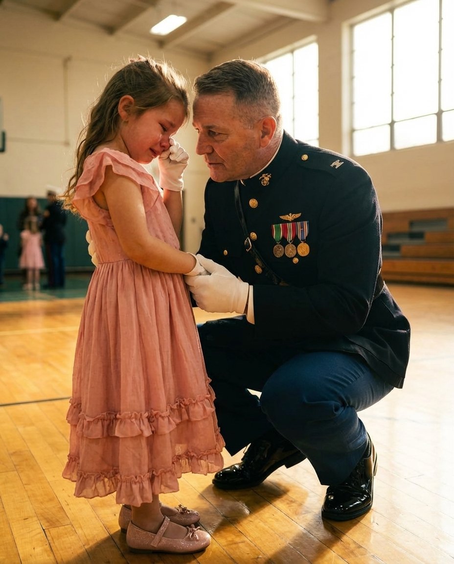 Then, just when it felt like we might leave early, everything changed. The gym doors opened, and a group of uniformed service members walked in together. Their presence immediately shifted the atmosphere, drawing everyone’s attention. One of them approached my daughter with kindness and respect, explaining that they were there to support her and honor her father’s memory. In that moment, what had been a difficult evening began to transform into something meaningful and uplifting.